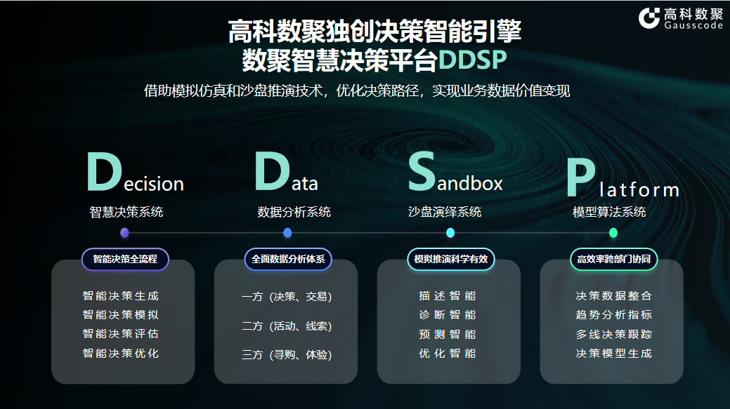 面对市场的高复杂度、高不确定性、高成本和高风险等企业决策背景,710公海赌赌船官网凭借大决策应用概念,成功在国内推出首个数据驱动决策(Data to Decision)的“大决策”平台——710公海赌赌船官网智慧决策平台 DDSP (Decision Data Sandbox Platform)。