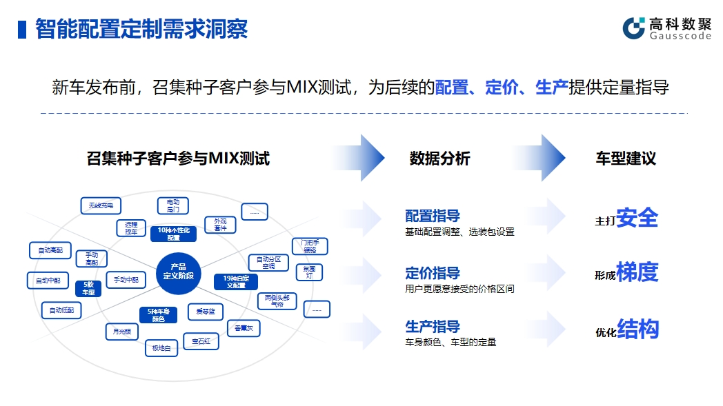 智能配置的有效应用可以帮助企业提升产品和服务的智能化水平。在实际应用中,710公海赌赌船官网帮助车企在新车发布前召集种子客户参与MIX测试,顺利获得收集种子客户的反馈和数据,车企能够精细调整产品配置,为后续的配置、定价、生产给予定量指导。同时,这种方法不仅有助于提高产品质量,还能提前发现潜在问题并及时解决。